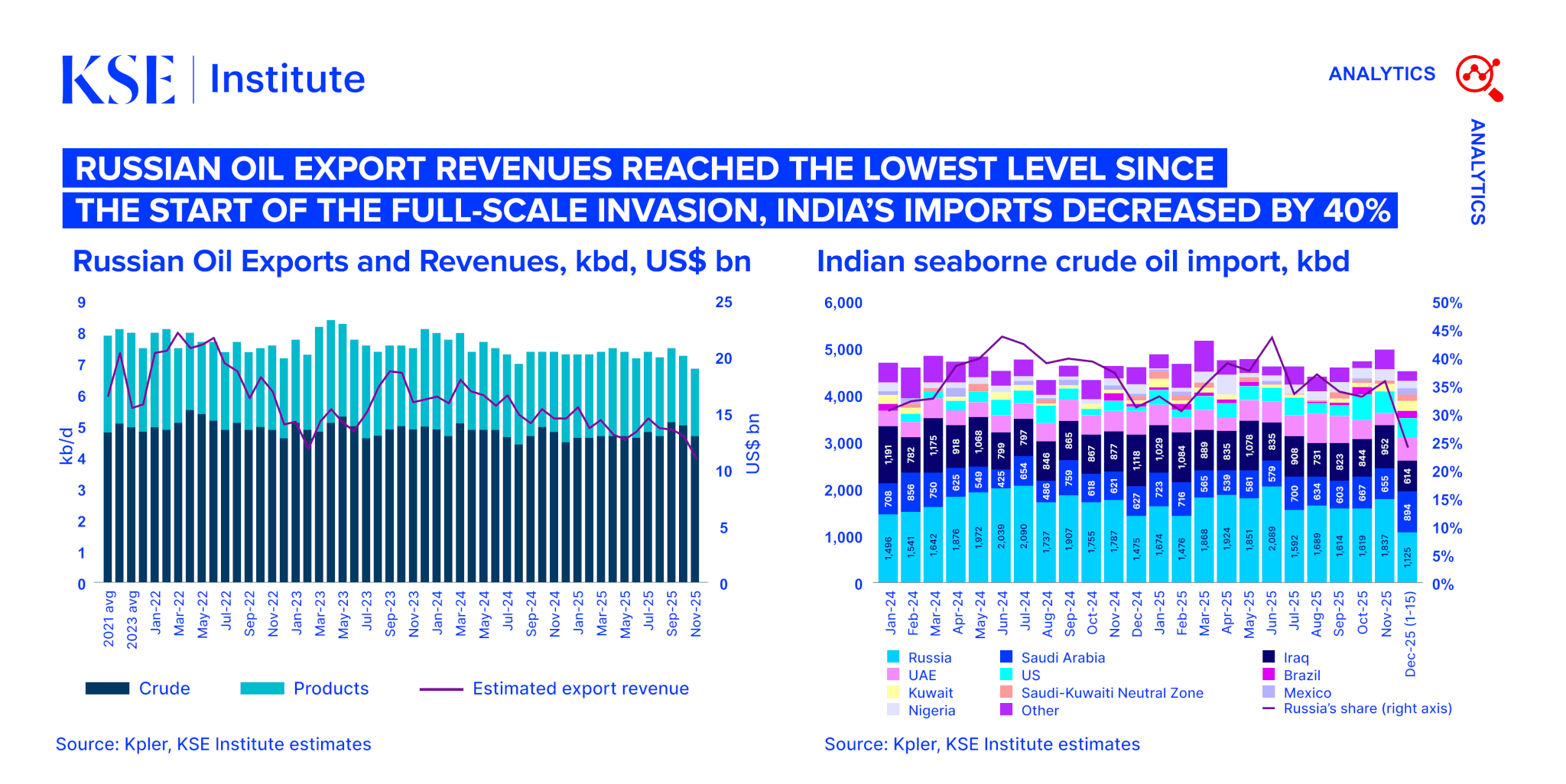 - Russian Oil Tracker – December 2025: Russian oil export revenues reached the lowest level since the start of the full-scale invasion, India’s imports decreased by 40%