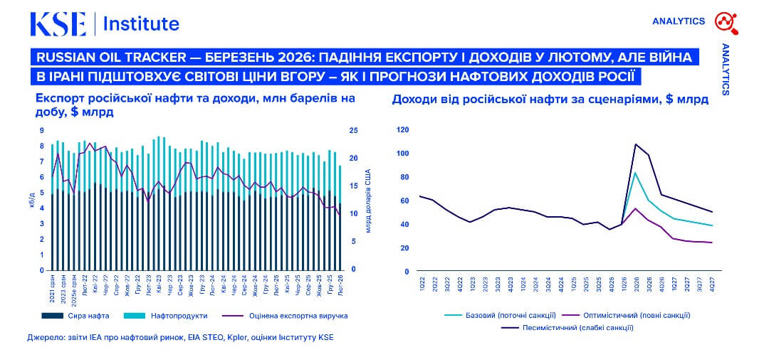 - Russian Oil Tracker — березень 2026: Падіння експорту і доходів у лютому, але війна в Ірані підштовхує світові ціни вгору – як і прогнози нафтових доходів Росії