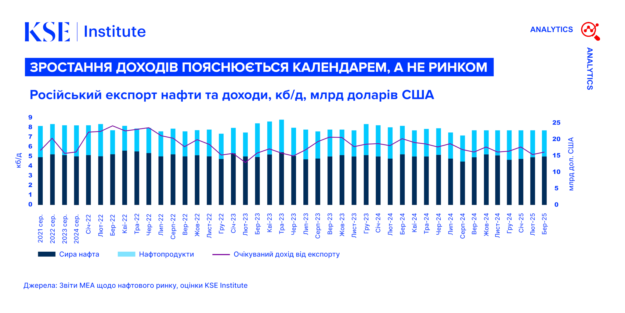 У березні 2025 року доходи Росії від експорту нафти зросли на $0,7 млрд до $14,3 млрд, згідно з квітневим випуском Russian Oil Tracker від KSE Institute. Основною причиною цього зростання стала більша кількість днів у місяці, а не покращення ринкових умов. Водночас у річному вимірі загальні доходи зменшилися на 3,7 млрд доларів.
