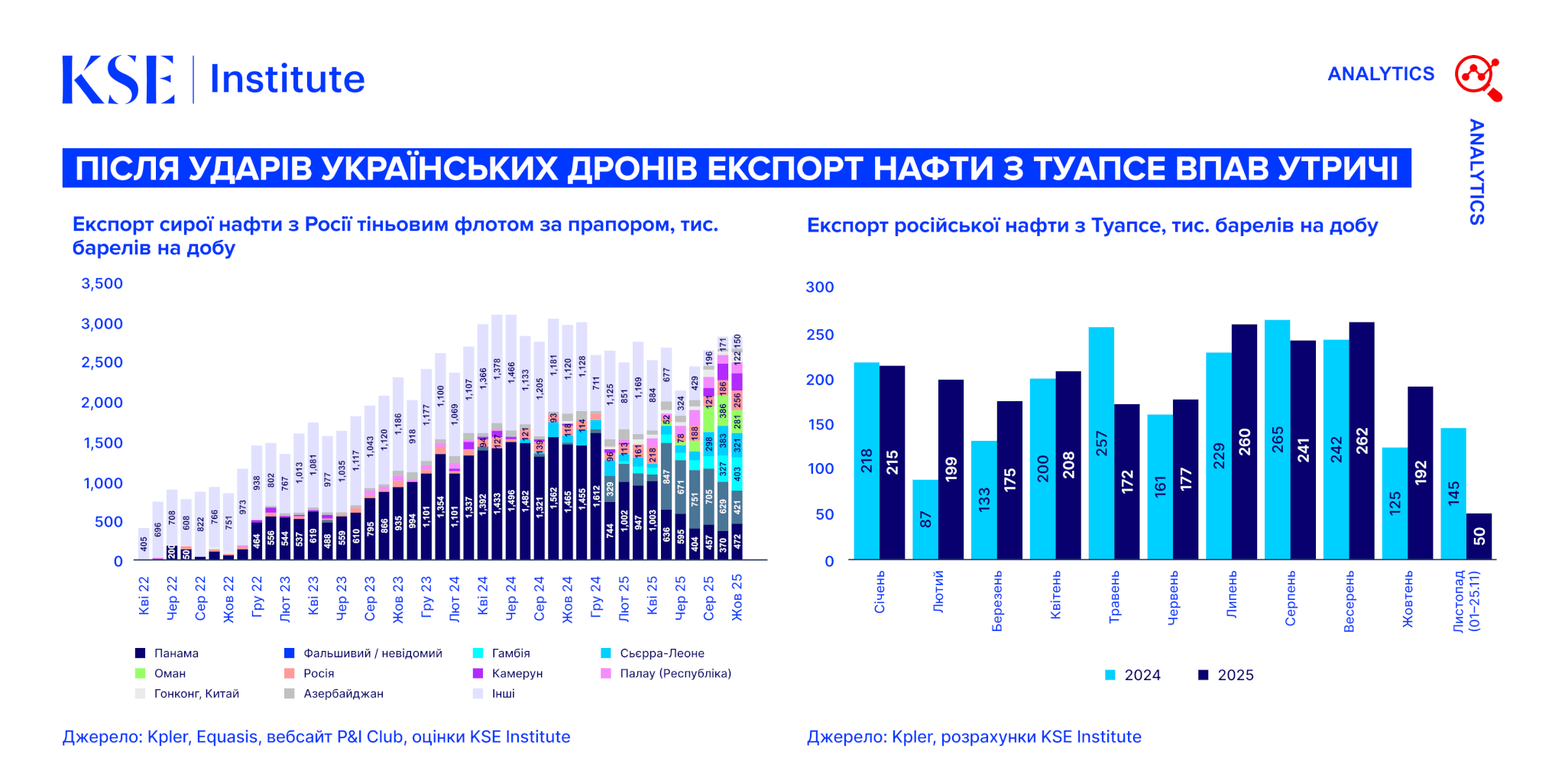 - Russian Oil Tracker – листопад 2025: Після ударів українських дронів експорт нафти з Туапсе впав утричі