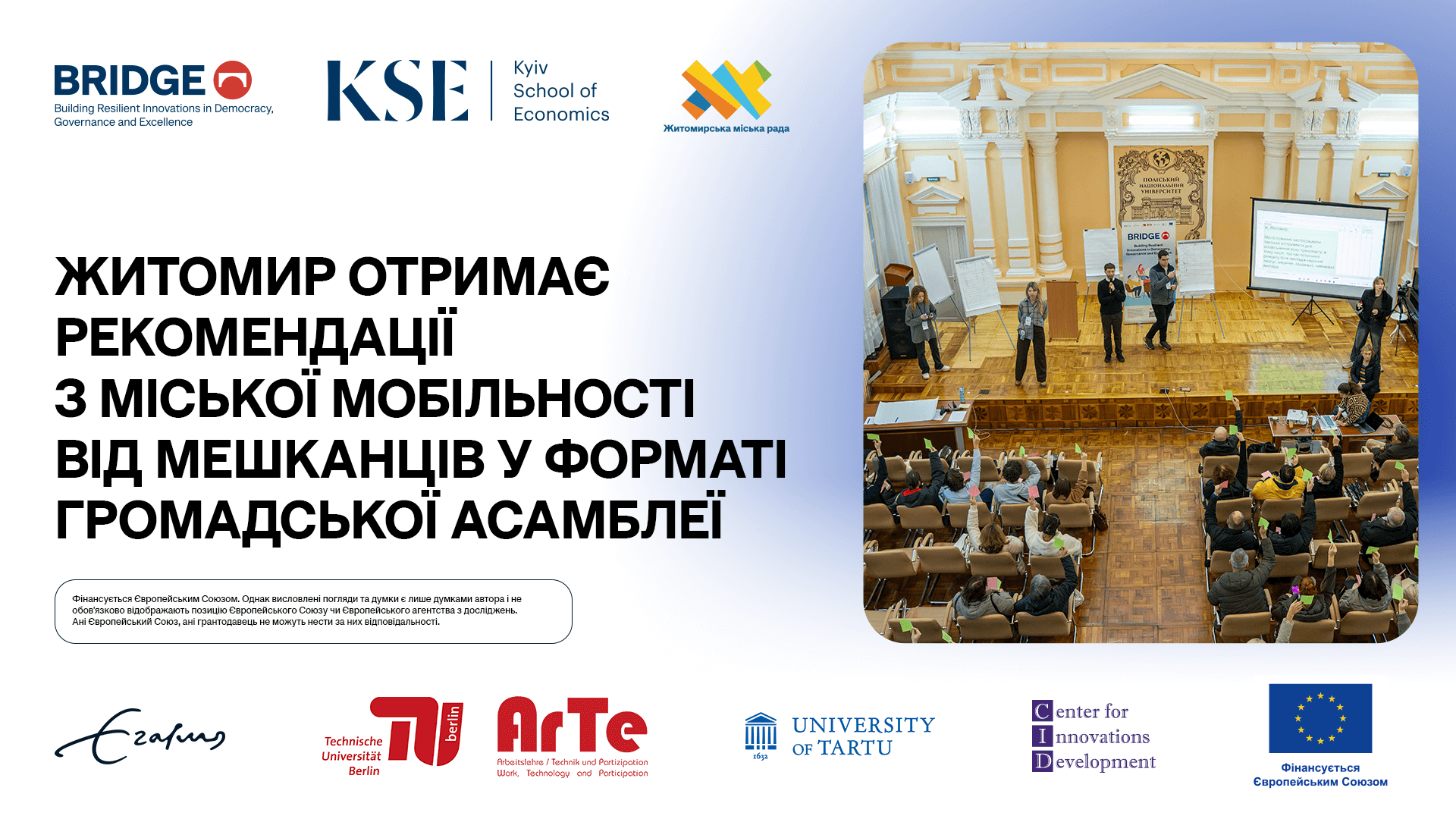 Громадська асамблея відбулася завдяки співпраці Житомирської міської ради й науковців проєкту BRIDGE з Київської школи економіки (KSE) і Технічного університету Берліна (TU Berlin). Вона є прикладом ефективної співпраці в межах наукового співробітництва між Європейським Союзом та Україною.